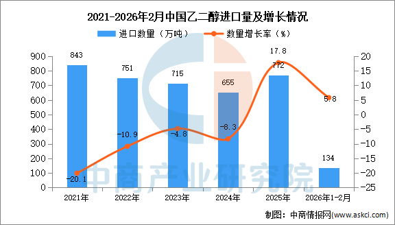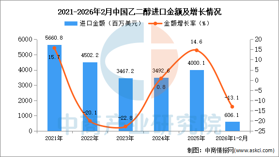 2026年2月中国乙二醇进口量及金额增长情况