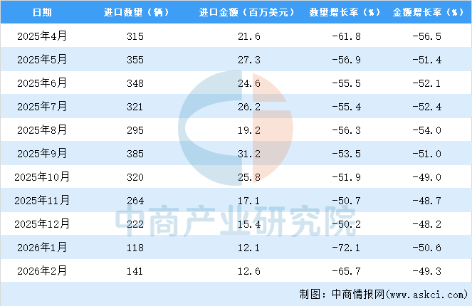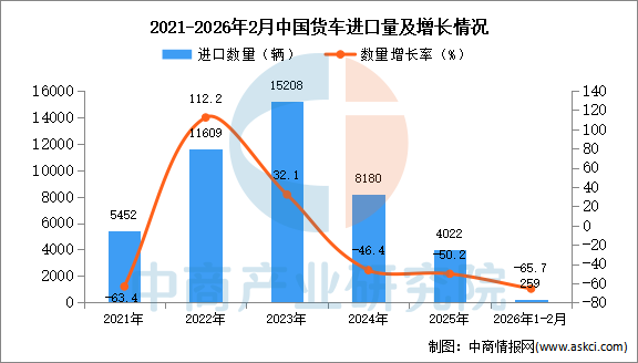 中商情报网讯:据中商产业研究院数据库显示,2025年中国货车进口量4022辆,同比下降50.2%。最新数据显示,2026年1-2月中国货车进口量259辆,同比下降65.7%。