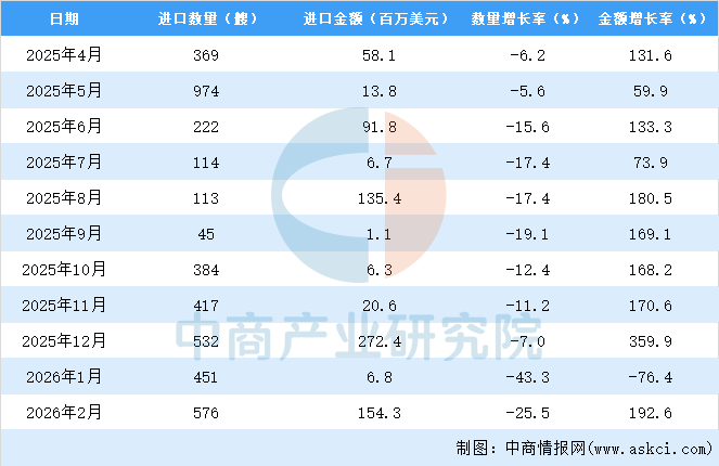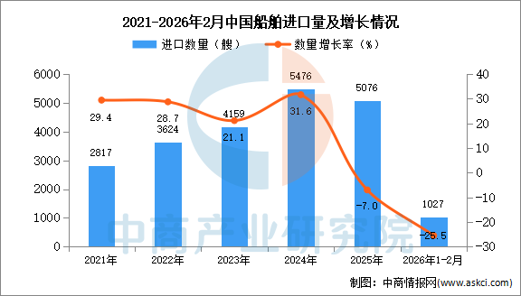 2026年2月中国船舶进口量及金额增长情况