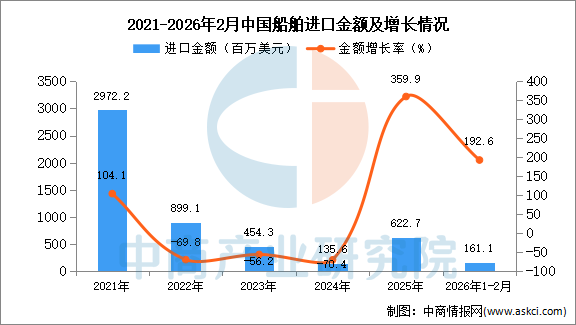 从金额方面来看,数据显示,2026年1-2月中国船舶进口金额161.1百万美元,同比增长192.6%。