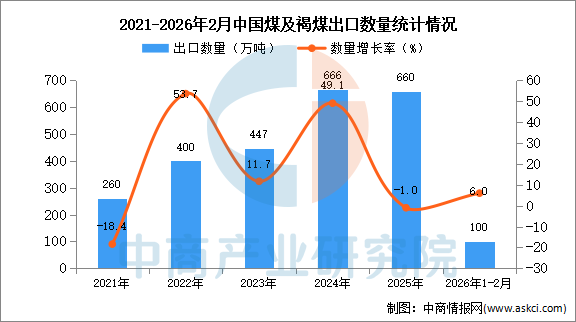 2026年2月中国煤及褐煤出口量及金额增长情况