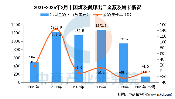 从金额方面来看,数据显示,2026年1-2月中国煤及褐煤出口金额952.6百万美元,同比下降25.1%。