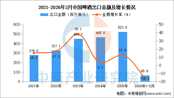 2026年1-2月中国啤酒出口量及金额增长情况