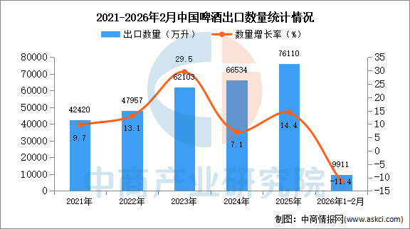 中商情报网讯:据中商产业研究院数据库显示,2025年我国啤酒的出口量76110万升,同比增长14.4%。最新数据显示,2026年1-2月中国啤酒出口量911万升,同比下降11.4%。