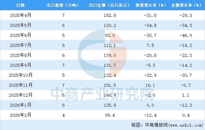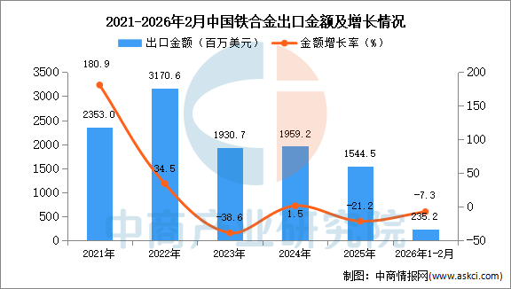 从金额方面来看,数据显示,2026年1-2月中国铁合金出口金额235.2百万美元,同比下降7.3%。