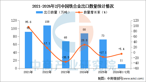 中商情报网讯:据中商产业研究院数据库显示,2025年我国铁合金的出口量73万吨,同比下降17.1%。最新数据显示,2026年1-2月中国铁合金出口量11万吨,同比下降5.4%。