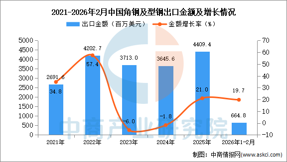 从金额方面来看,数据显示,2026年1-2月中国角钢及型钢出口金额664.8百万美元,同比增长19.7%。