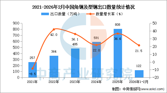 中商情报网讯:据中商产业研究院数据库显示,2025年中国角钢及型钢出口量808万吨,同比增长36.6%。最新数据显示,2026年1-2月中国角钢及型钢出口量122万吨,同比增长21.5%。