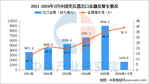从金额方面来看,数据显示,2026年1-2月中国变压器出口金额1676.8百万美元,同比增长38.9%。