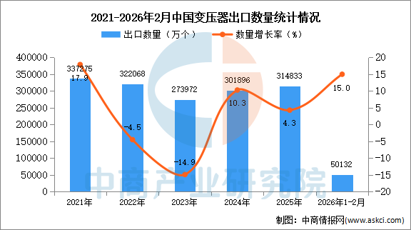 中商情报网讯:据中商产业研究院数据库显示,2025年中国变压器出口量314833万个,同比增长4.3%。最新数据显示,2026年1-2月中国变压器出口量50132万个,同比增长15%。