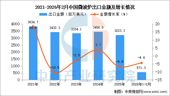 从金额方面来看,数据显示,2026年1-2月中国微波炉出口金额571.3百万美元,同比下降4.4%。