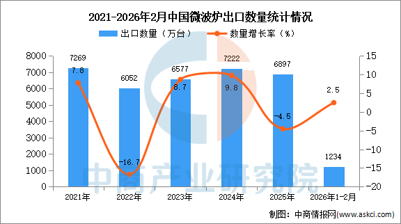 中商情报网讯:据中商产业研究院数据库显示,2025年中国微波炉出口量6897万台,同比下降4.5%。最新数据显示,2026年1-2月中国微波炉出口量1234万台,同比增长2.5%。