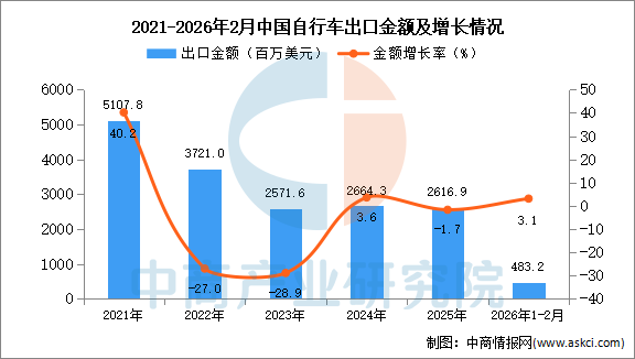 从金额方面来看,数据显示,2026年1-2月中国自行车出口金额483.2百万美元,同比增长3.1%。