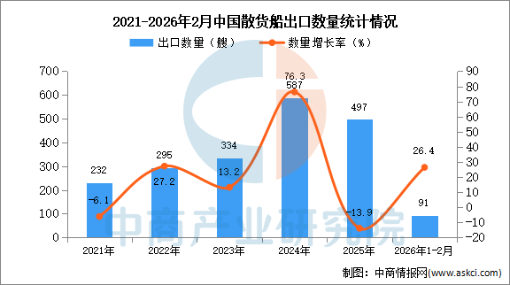 中商情报网讯:据中商产业研究院数据库显示,2025年中国散货船出口量497艘,同比下降13.9%。最新数据显示,2026年1-2月国散货船出口量91艘,同比增长26.4%。