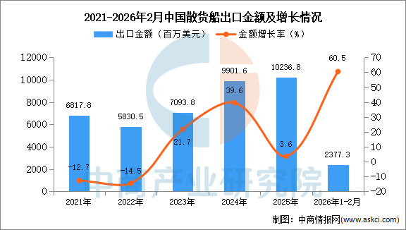 从金额方面来看,数据显示,2026年1-2月中国散货船出口金额2377.3百万美元,同比增长60.5%