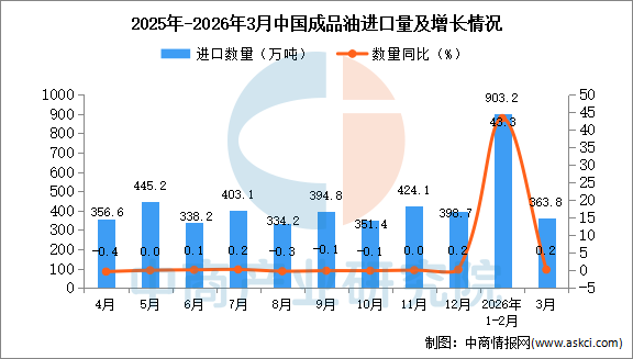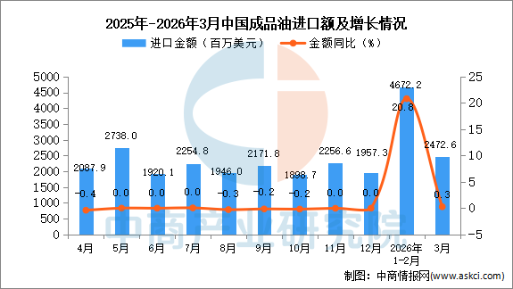 2026年3月中国成品油进口量及金额增长情况