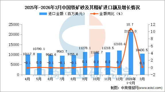 2026年3月中国铁矿砂及其精矿进口量及金额增长情况