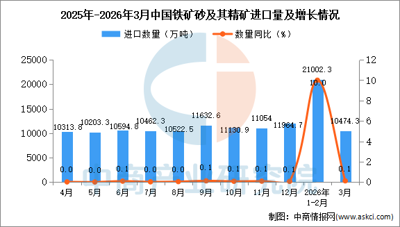中商情报网讯:据中商产业研究院数据库显示,2026年3月中国铁矿砂及其精矿进口量10474.3万吨,同比增长0.1%;1-3月中国铁矿砂及其精矿进口量31476.2万吨,同比增长10.5%。