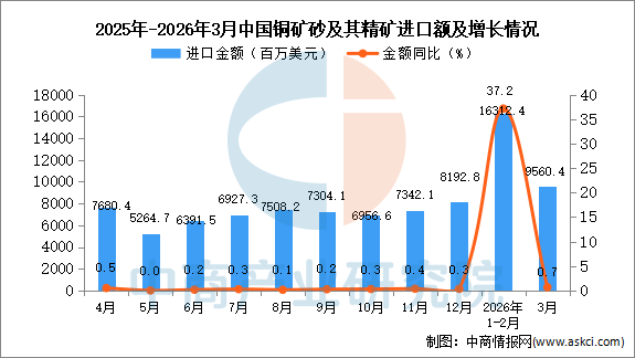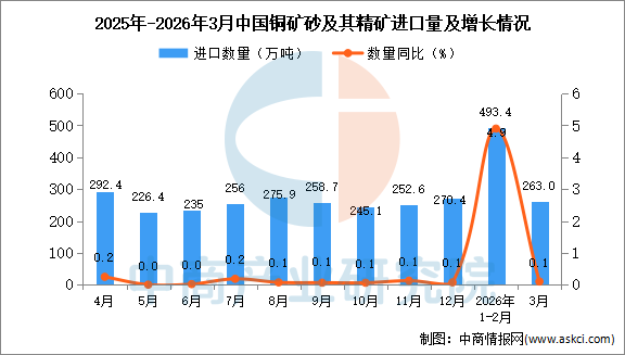 2026年3月中国铜矿砂及其精矿进口量及金额增长情况