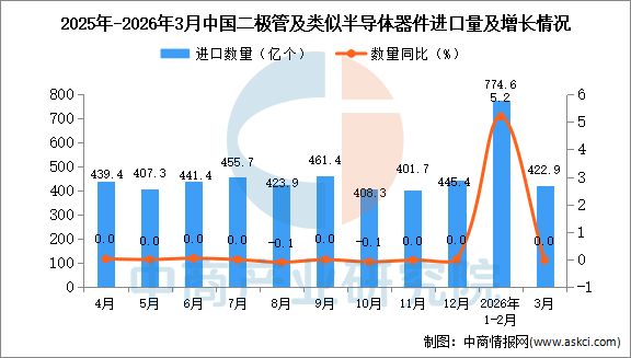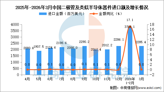 2026年3月中国二极管及类似半导体器件进口量及金额增长情况