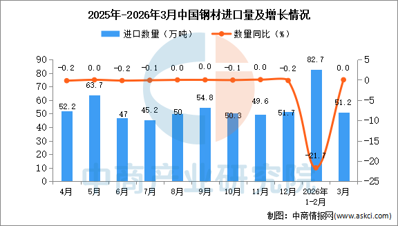 中商情报网讯:据中商产业研究院数据库显示,2026年3月中国钢材进口量51.2万吨,同比增长持平;1-3月中国钢材进口量133.9万吨,同比下降14.1%。
