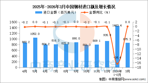 从金额方面来看,2026年3月中国钢材进口金额875.3百万美元,同比增长持平;1-3月中国钢材进口金额2338.7百万美元,同比下降10.5%。