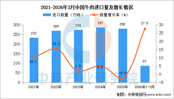 中商情报网讯:据中商产业研究院数据库显示,2025年中国牛肉进口量280万吨,同比下降2.5%。最新数据显示,2026年1-3月中国牛肉进口量87万吨,同比增长27.5%。