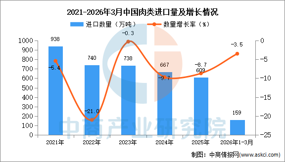 中商情报网讯:据中商产业研究院数据库显示,2025年中国肉类(包括杂碎)进口量609万吨,同比下降8.7%。最新数据显示,2026年1-3月中国肉类(包括杂碎)进口量159万吨,同比下降3.5%。