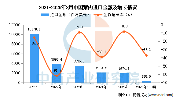从金额方面来看,数据显示,2026年1-3月中国猪肉进口金额355百万美元,同比下降37.2%。