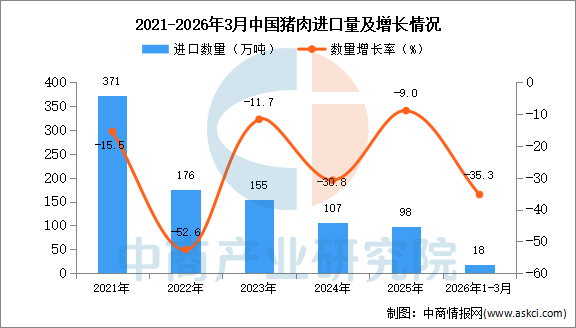 中商情报网讯:据中商产业研究院数据库显示,2025年中国猪肉进口量98万吨,同比下降9%。最新数据显示,2026年1-4月中国猪肉进口量18万吨,同比下降35.3%。