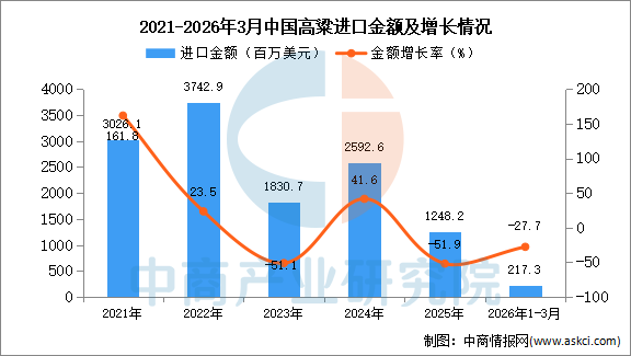 2026年3月中国高粱进口量及金额增长情况