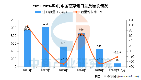 中商情报网讯:据中商产业研究院数据库显示,2025年中国高粱进口量454万吨,同比下降47.5%。最新数据显示,2026年1-3月中国高粱进口量85万吨,同比下降22.9%。