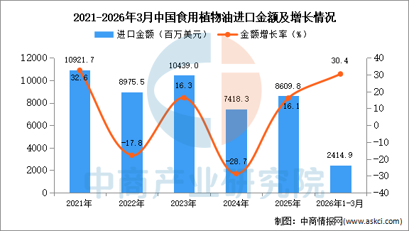 从金额方面来看,数据显示,2026年1-3月中国食用植物油进口金额2414.9百万美元,同比增长30.4%。