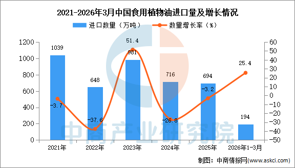 中商情报网讯:据中商产业研究院数据库显示,2025年中国食用植物油进口量694万吨,同比下降3.2%。最新数据显示,2026年1-3月中国食用植物油进口量194万吨,同比增长25.4%。
