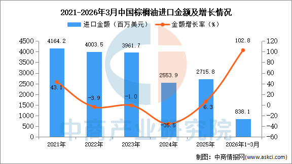 2026年3月中国棕榈油进口量及金额增长情况