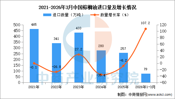 中商情报网讯:据中商产业研究院数据库显示,2025年中国棕榈油进口量257万吨,同比下降8.2%。最新数据显示,2026年1-3月中国棕榈油进口量79万吨,同比增长107.2%。