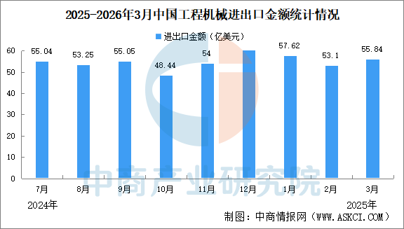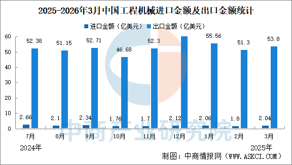 中商情报网讯:2026年3月我国工程机械进出口贸易额为55.84亿美元,同比增长8.08%,其中:进口额2.04亿美元,同比下降20%;出口额53.8亿美元,同比增长9.54%。
