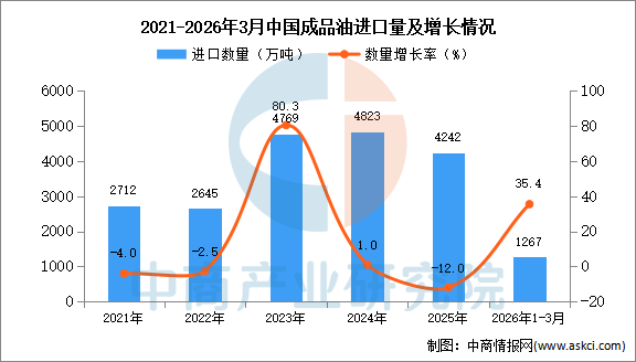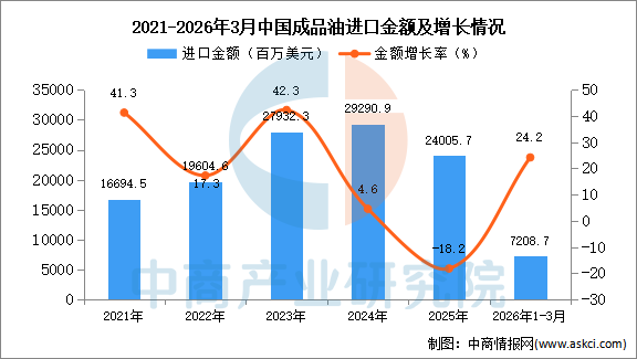 2026年3月中国成品油进口量及金额增长情况