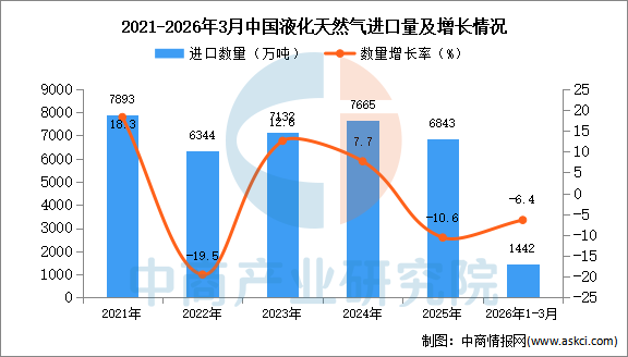 中商情报网讯:据中商产业研究院数据库显示,2025年中国液化天然气进口量6843万吨,同比下降10.6%。最新数据显示,2026年1-3月中国液化天然气进口量1442万吨,同比下降6.4%。