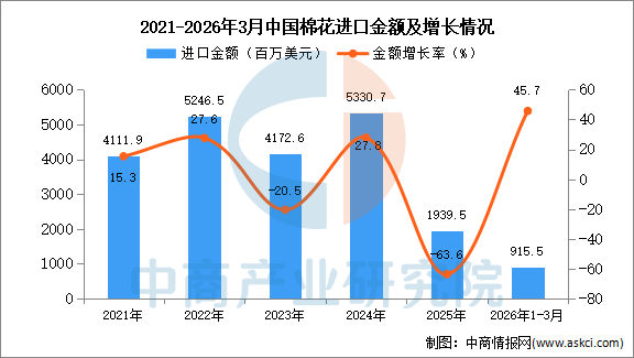 从金额方面来看,数据显示,2026年1-3月中国棉花进口金额915.5百万美元,同比增长45.7%。