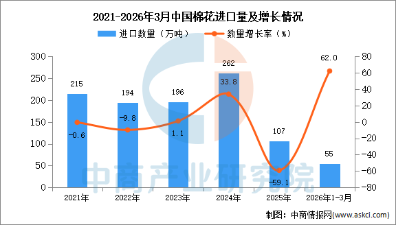 中商情报网讯:据中商产业研究院数据库显示,2025年中国棉花进口量107万吨,同比下降59.1%。最新数据显示,2026年1-3月中国棉花进口量55万吨,同比增长62%。
