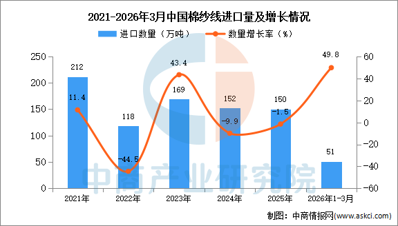 中商情报网讯:据中商产业研究院数据库显示,2025年中国棉纱线进口量150万吨,同比下降1.5%。最新数据显示,2026年1-3月中国棉纱线进口量51万吨,同比增长49.8%。