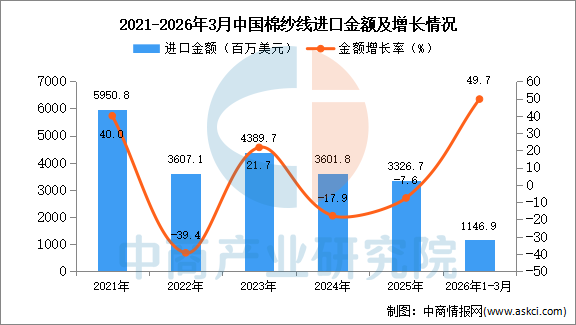 从金额方面来看,数据显示,2026年1-3月中国棉纱线进口金额1146.9百万美元,同比增长49.7%。