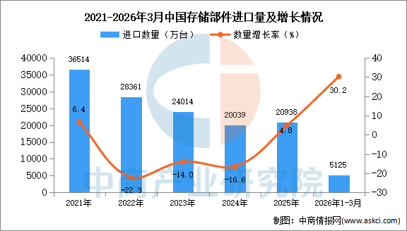 中商情报网讯:据中商产业研究院数据库显示,2025年中国存储部件进口量20938万台,同比增长4.8%。最新数据显示,2026年1-3月中国存储部件进口量5125万台,同比增长30.2%。