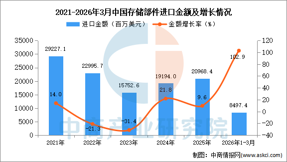 2026年3月中国存储部件进口量及金额增长情况
