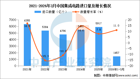 中商情报网讯:据中商产业研究院数据库显示,2025年我国集成电路的进口量5917亿个,同比增长7.8%。最新数据显示,2026年1-3月中国集成电路进口量1457亿个,同比增长11%。