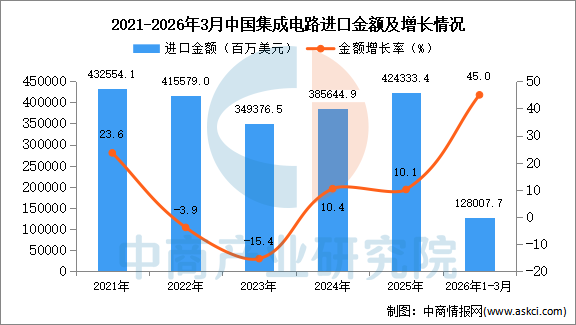 从金额方面来看,数据显示,2026年1-3月中国集成电路进口金额128007.7百万美元,同比增长45%。