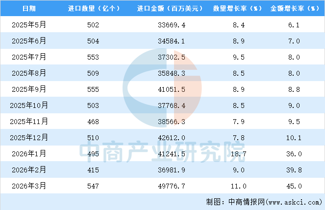 2026年3月中国集成电路进口量及金额增长情况
