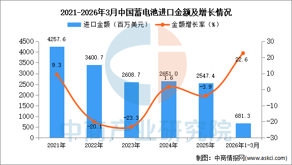 2026年3月中国蓄电池进口量及金额增长情况