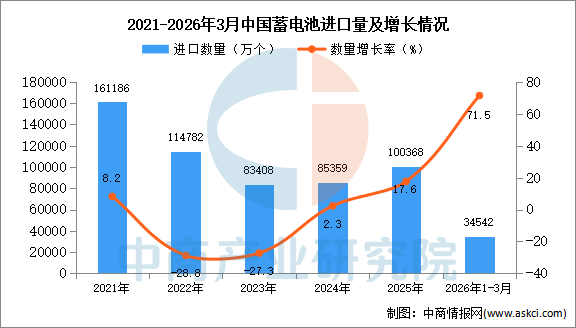 中商情报网讯:据中商产业研究院数据库显示,2025年中国蓄电池进口量100368万个,同比增长17.6%。最新数据显示,2026年1-3月中国蓄电池进口量34542万个,同比增长71.5%。
